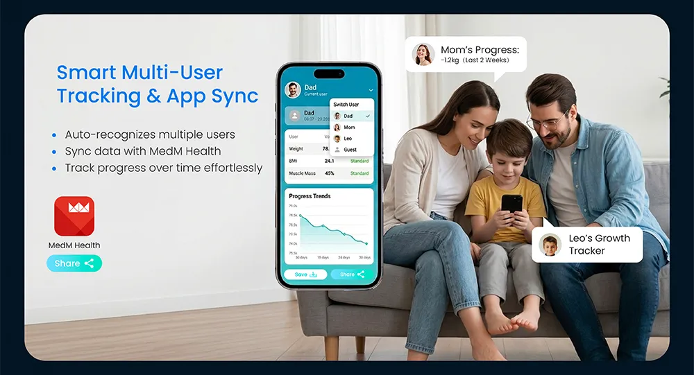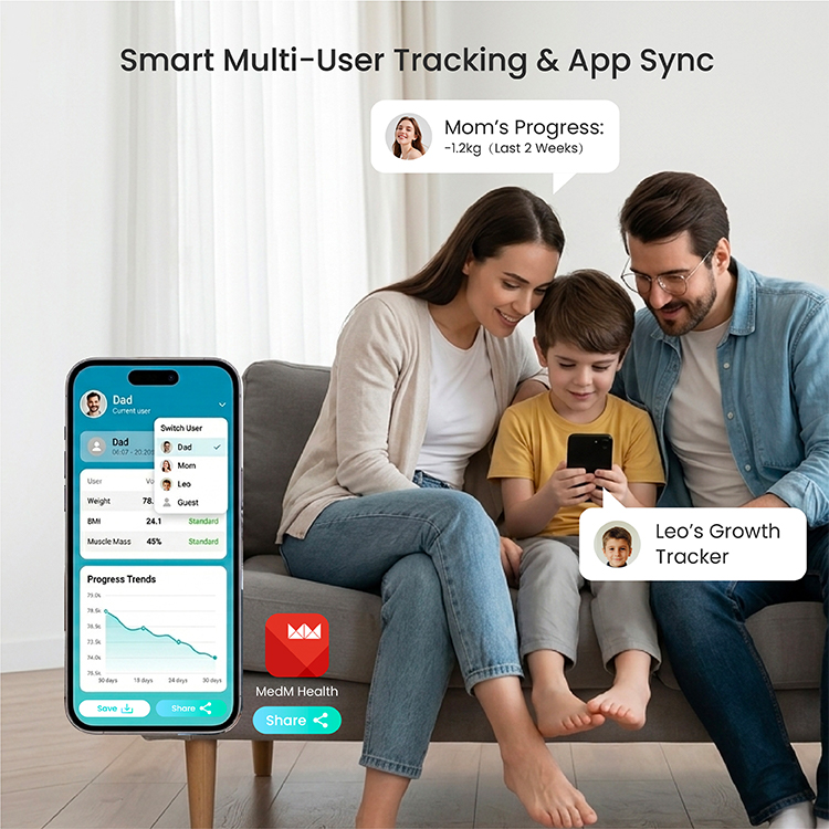 Pantalla LCD colorida, fuentes grandes fáciles de leer Soporte multiusuario para compartir en familia Análisis De Composición De Cuerpo Completo Conexión Bluetooth, APLICACIÓN MedM